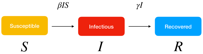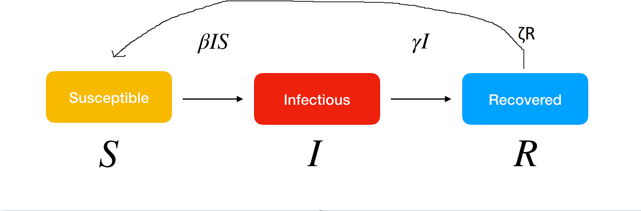 \[ \begin{aligned} \frac{dS}{dt} &= -\beta I S + \zeta R\\ \frac{dI}{dt} &= \beta I S - \gamma I \\ \frac{dR}{dt} &= \gamma I - \zeta R \end{aligned} \]