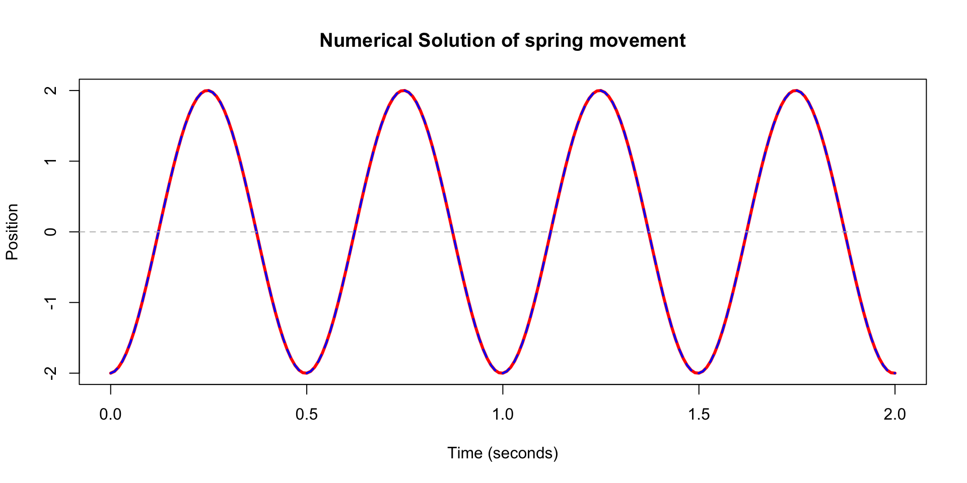 out <- ode(y = state, times = times, func = spring_ode, parms = parameters)