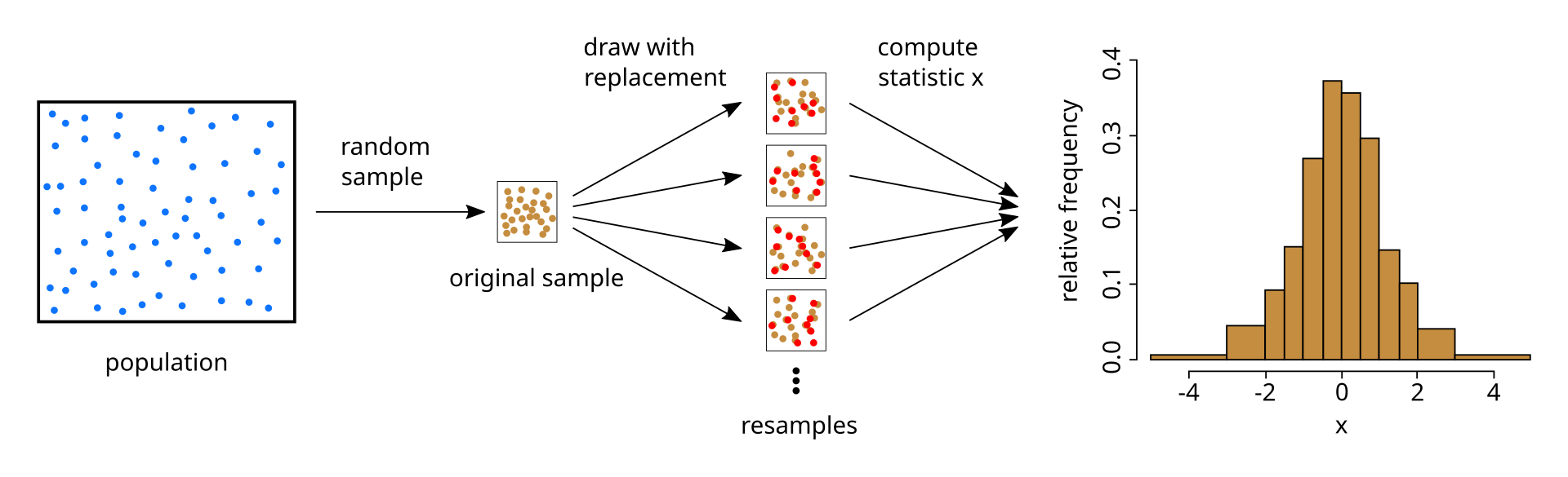 boot package for easy bootstrapping.rsample package and advanced R programming techniques to iterate over lists of bootstrap resamples.credit: https://commons.wikimedia.org/wiki/File:Illustration_bootstrap.svg