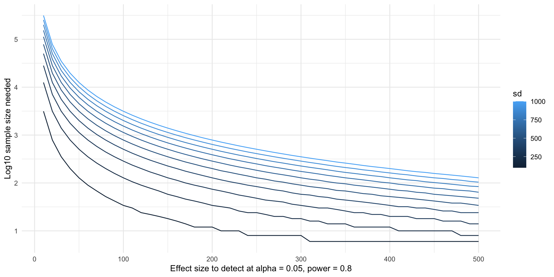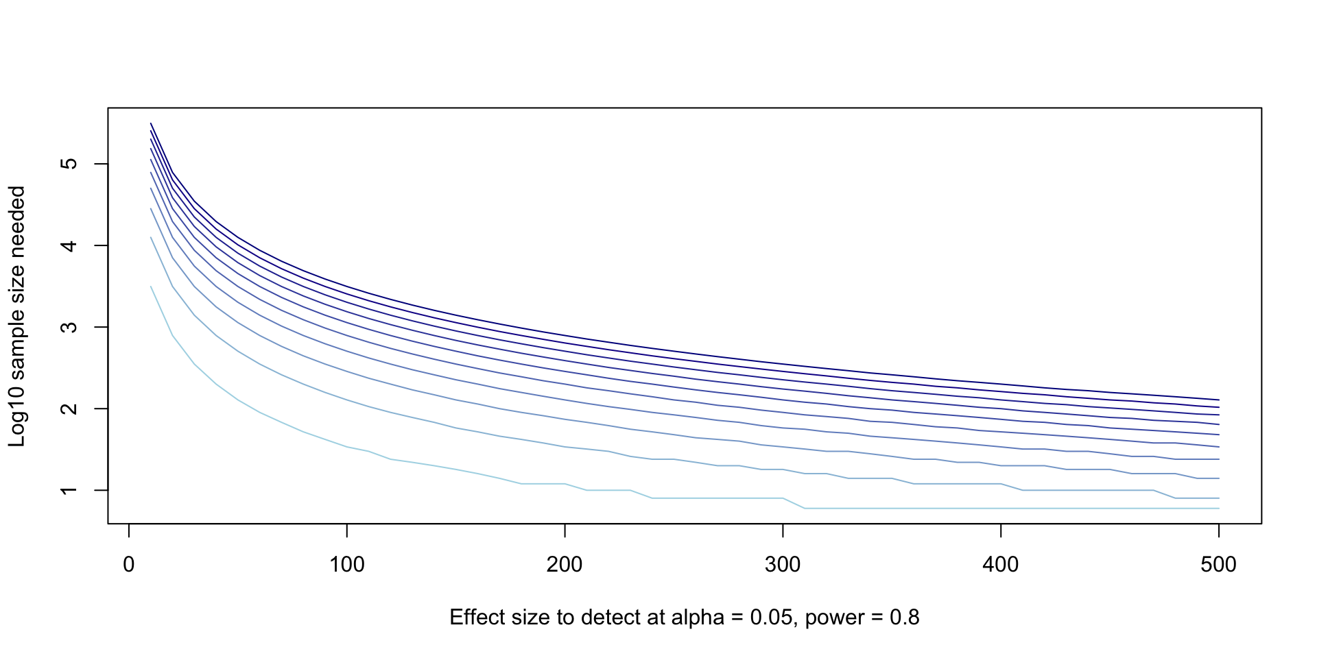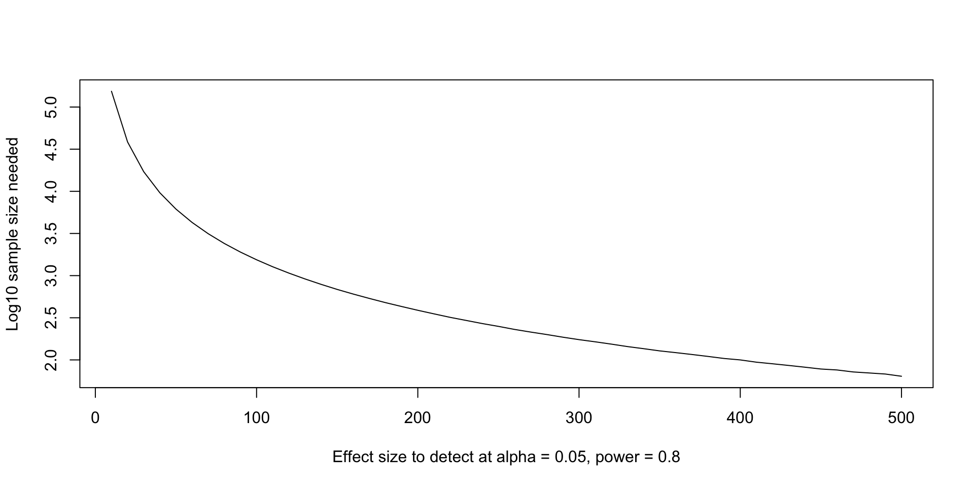 x = "Effect size to detect at alpha = 0.05, power = 0.8",
